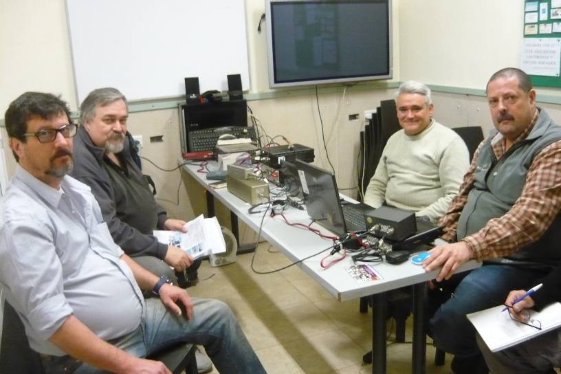26 de Abril de 2014: Reunión Técnica preparatoria de una visita a CNEA-CAC para reparación de equipos del nodo y gateway APRS de LU7AA Amsat Argentina. Pedro, LU7ABF; Raul, LU5AG; Mariano, LU9ACJ; Alejandro, LU5ALE y Martín, LU4BME. Durante la misma se exhibieron fotos de anteriores tareas en ese nodo y se planificaron las pruebas. |