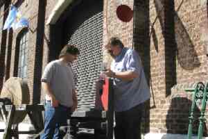 Cuando se iba terminando la tarde, la gente del Museo colocó una lámpara en la reja para mejorar la iluminación en la mesa. A la derecha está el encargado de la parte eléctrica del edificio. (85 KB)