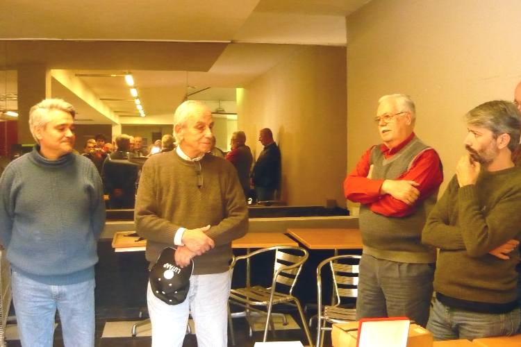 En el centro Marcelo, LU7AAP que cuenta detalles del origen y la fundación de la Peña de Radioaficionados QRM Belgrano en 1968, y de las ruedas que se armaban en 80 metros AM con sus integrantes. A la izquierda Raul, LU5AG y a la derecha Alberto, LU1DZ, que comenta: "Yo los escuchaba, eran muy bulliciosos!" y Guillemo, LU8DQ.