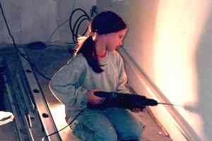 Daniela, LU5AMD, con un taladro rotopercutor, hace los agujeros para tarugos plásticos. (55 KB)