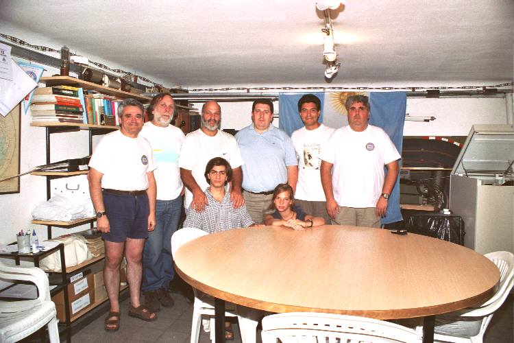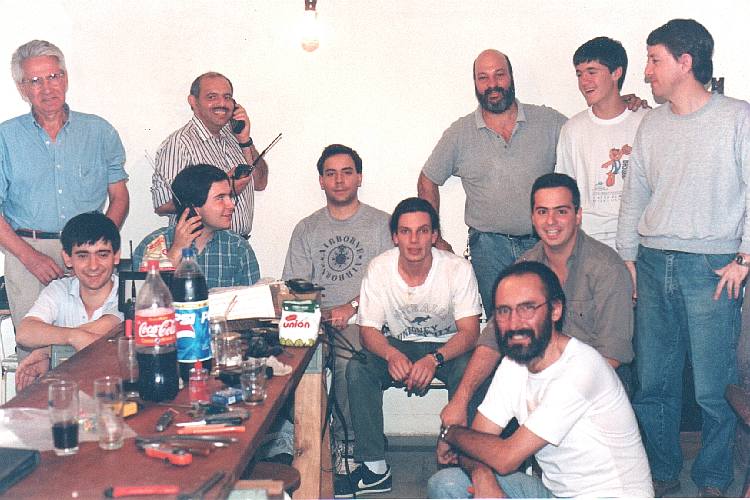 Sentados: Roberto, LU4AWA; Diego, LW3DAO; Marcelo, LU6AXV; Hernán, LU9ANM; Alejandro, LU9ANJ y Víctor, LU1CPL. De pie: Lucho, LU9AE; Néstor, LU6AKP; Guillermo, LW8DTO; Eugenio, entonces LU1AVO; y Daniel, LU5AKP. (67 KB)