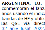 |   Viernes 22, Sábado 23 y Domingo 24 de Enero de 2016:   Fin de Semana del LUSAT - QSL Conmemorativa 26º Aniversario del LUSAT. Multibanda, multimodo, incluyendo APRS y satélite. Vea toda la información en:   http://lusat.org.ar, sitio web del LUSAT-1.   Parte operativa de esta operación radial y QSL Conmemorativa.