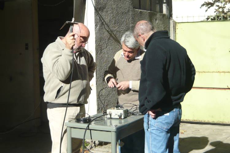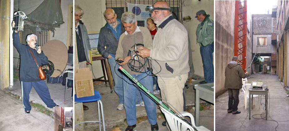 Ignacio, LU1ESY, haciendo las primeras pruebas; Raul, LU5AG y Guillermo, LW8DTO, probando la antena de referencia;